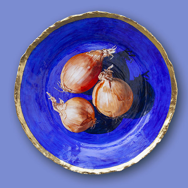 Uien op ultramarijn | Oil paint and 24 carat gold leaf on handmade plate | 45x45x7cm |