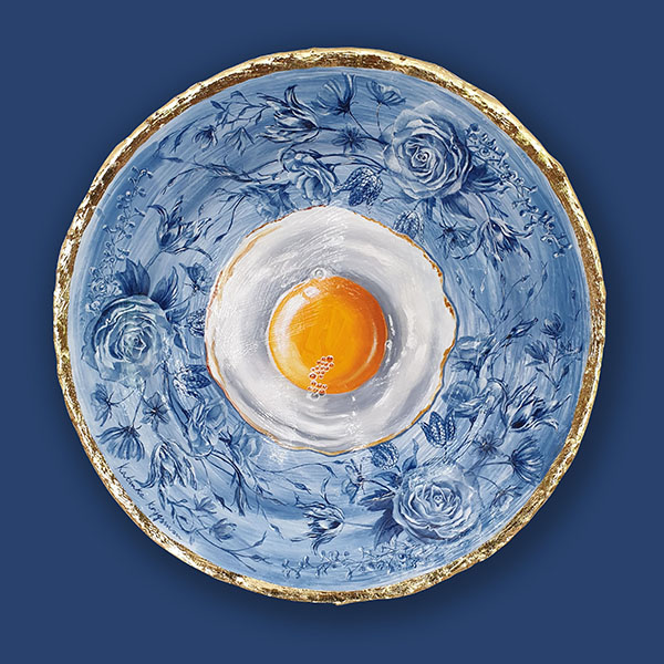 Uit balans? Een ei maakt je blij | Oil paint and 24 carat gold leaf on handmade plate | 92x92x9 cm |