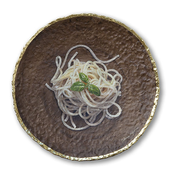 Spaghetti Basilicum | Oil paint and 24 carat gold leaf on handmade plate | 60x60x8 cm |