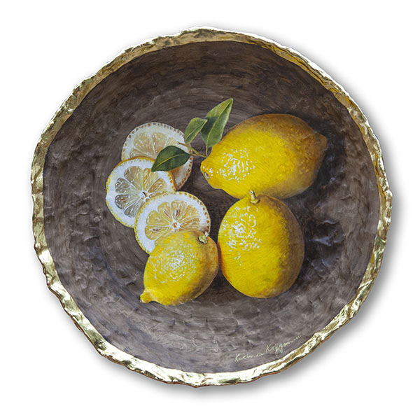 Citroenen op bloemenpracht | Oil paint and 24 carat gold leaf on handmade plate | 75x75x9 cm |