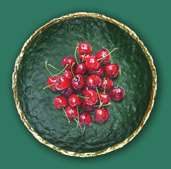 Kersen op groene aarde | Oil paint and goldleaf on handmade plate | 44x44x7 cm |