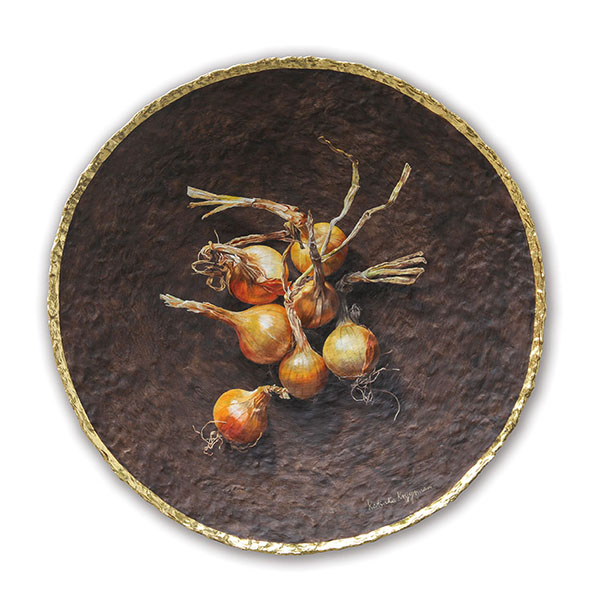 Uien van 't lankie | Oil paint and goldleaf on handmade plate | 60x60x8 cm |