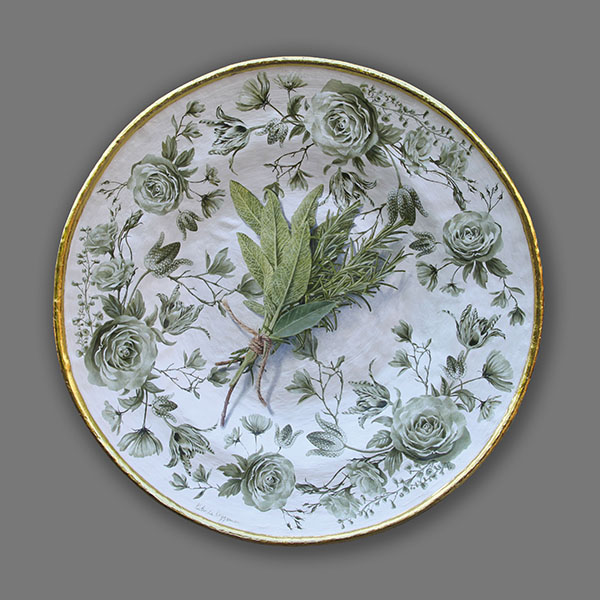 Salie en rozemarijn | Oil paint and goldleaf on handmade plate | 75x75x8 cm |