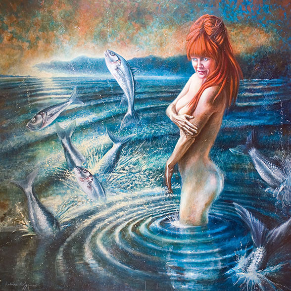 Vissen in zee | Oil paint on handmade plate | 45x45x7 cm |