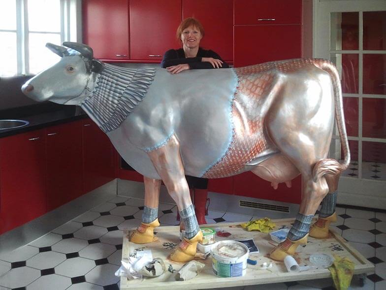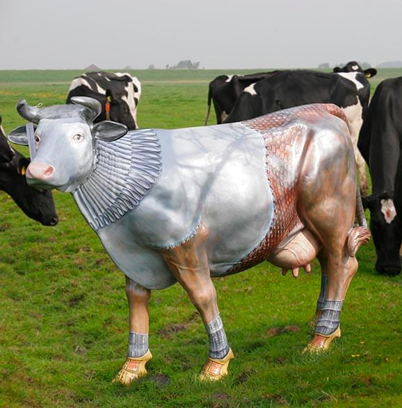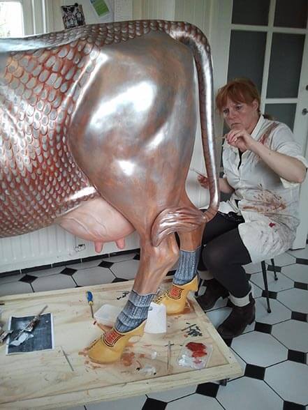 AN ART COW FOR CONO KAAS: In 2012 the Beemster existed 400 years. That was extensively celebrated with all kinds of activities. CONO gave the command to eleven 'Noordhollandse' artists to make a happy cow. Katinka Krijgsman: "it was clear to me that the elements of 400 years Beemster there in had to be processed. Originally there was fishing, so from seafood to cow was a logical step. The scales are made flesh and dry feet were also important, therefore, wooden shoes and woolen socks. Beasts to be pampered and cultivated, hence the millstone collar and small hat. Keep the udders of naturally ... naturally."