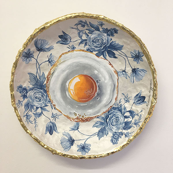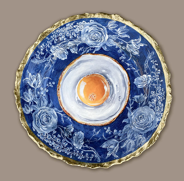 Uit balans? Een ei maakt je blij | Oil paint and 24 carat gold leaf on handmade plate | 92x92x9 cm |