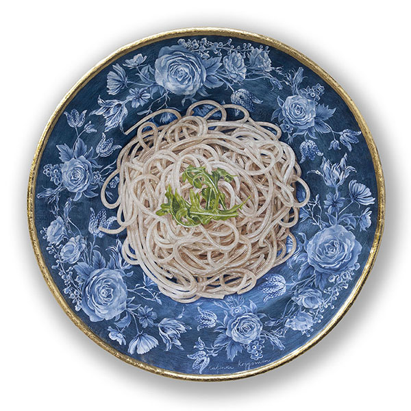 Spaghetti Basilicum | Oil paint and 24 carat gold leaf on handmade plate | 60x60x8 cm |