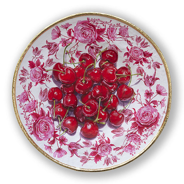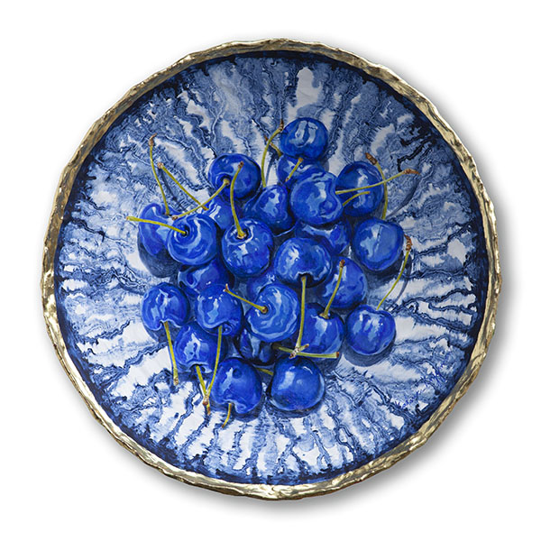 Blauwe kersen | Oil paint and 24 carat gold leaf on handmade plate | 44x44x7 cm |