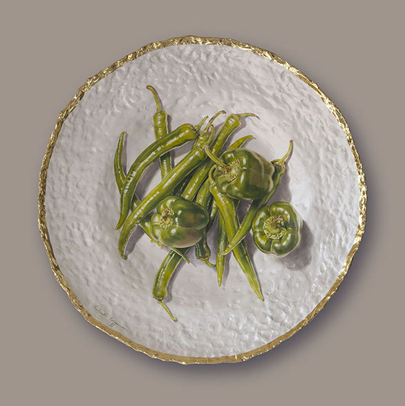 Groene pepers op parelmoer | Oil paint and 24 carat gold leaf on handmade plate | 44x44x7 cm |