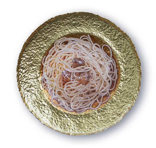 Pici Vongole | Oil paint and 24 carat gold leaf on handmade plate | 75x75x8cm