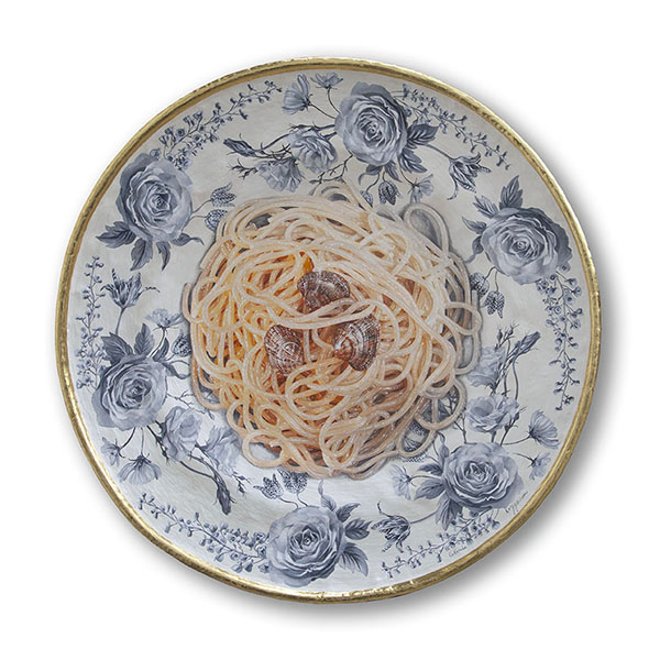 Spaghetti Vongole op bloemenpracht | Oil paint and 24 carat gold leaf on handmade plate | 75x75x9 cm |