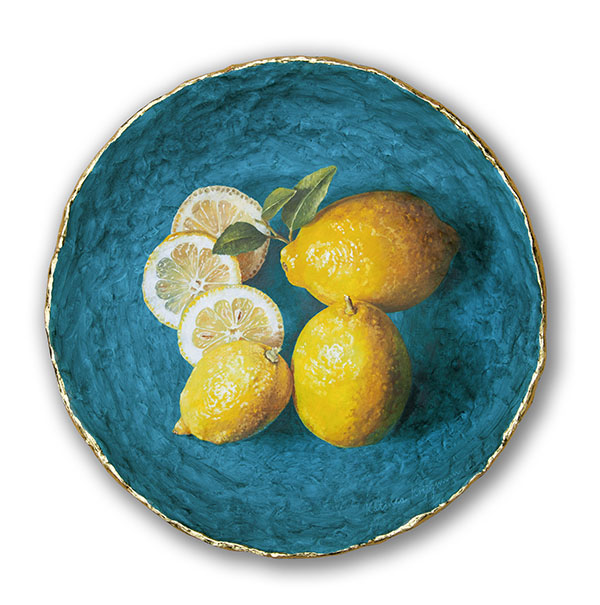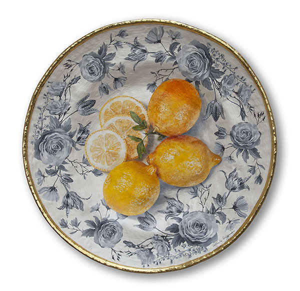 Citroenen op bloemenpracht | Oil paint and 24 carat gold leaf on handmade plate | 75x75x9 cm |