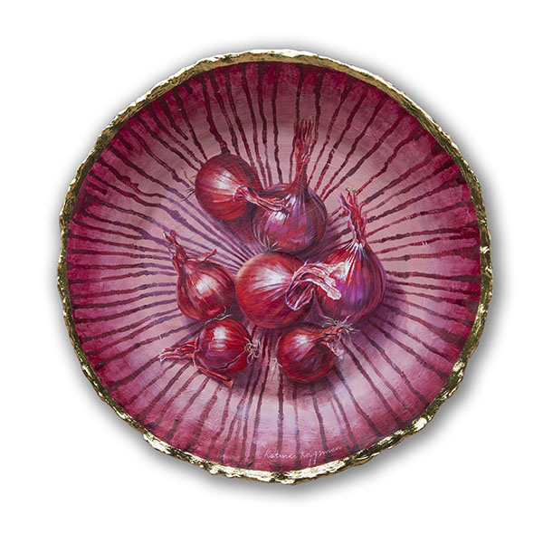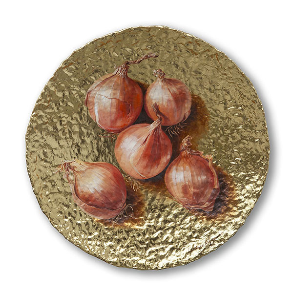 Rode uien ton sur ton | Oil paint and 24 carat gold leaf on handmade plate | 45x45x7 cm |