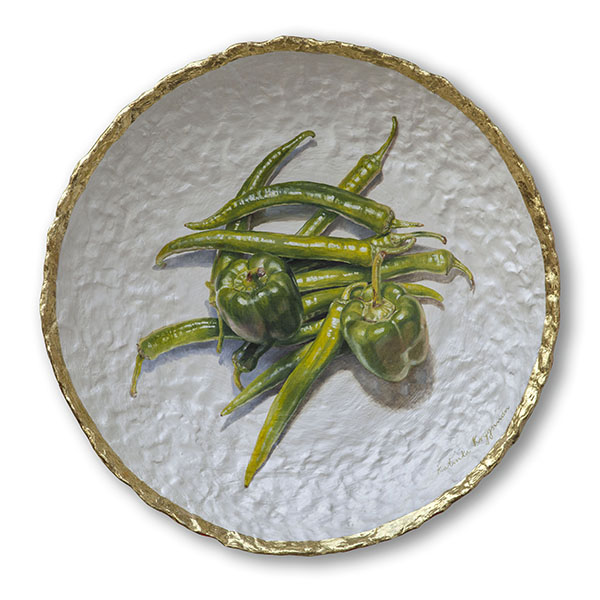 Green peppers | Oil paint and 24 carat gold leaf on handmade plate | 75x75x8cm |