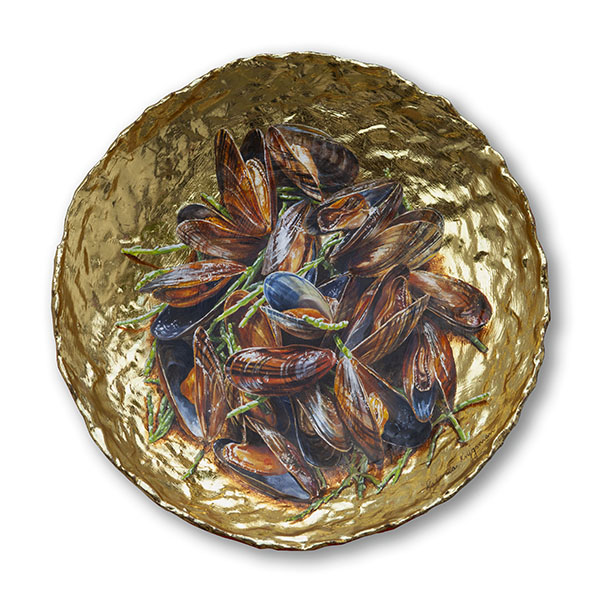 Moules Marinière| Oil paint and 24 carat gold leaf on handmade plate | 75x75x9 cm |